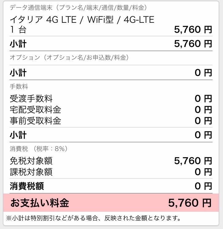 今回申し込んだグローバルWiFiの料金は、以下のように合計JPY5,760でした。